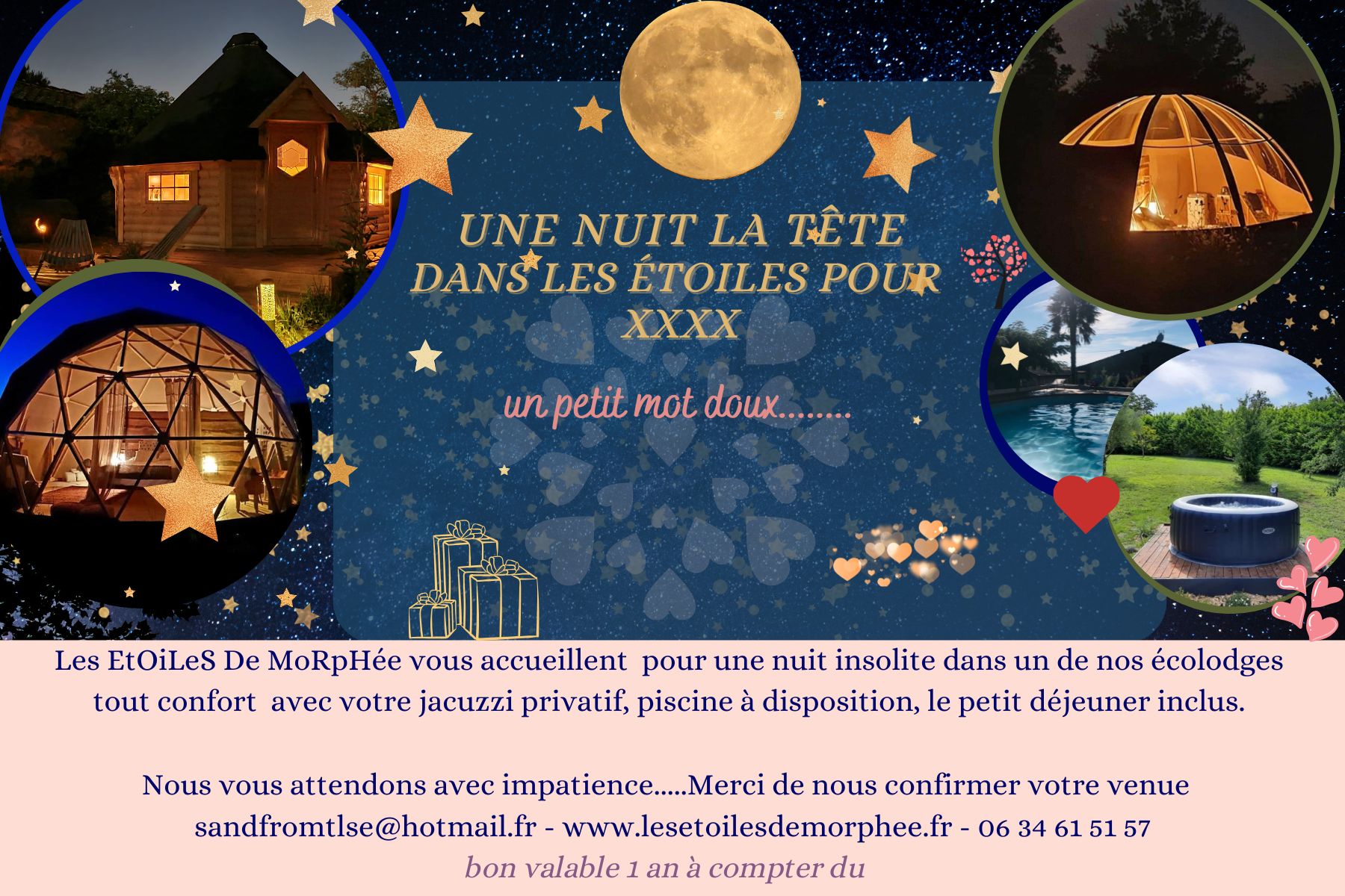 Nyx, mère de Morphée vous accueille au sein d'un écrin de verdure avec un confort absolu ... pourvu d'un spa privatif extérieur ..vous serez au calme pour une nuit cocooning sous les étoiles .